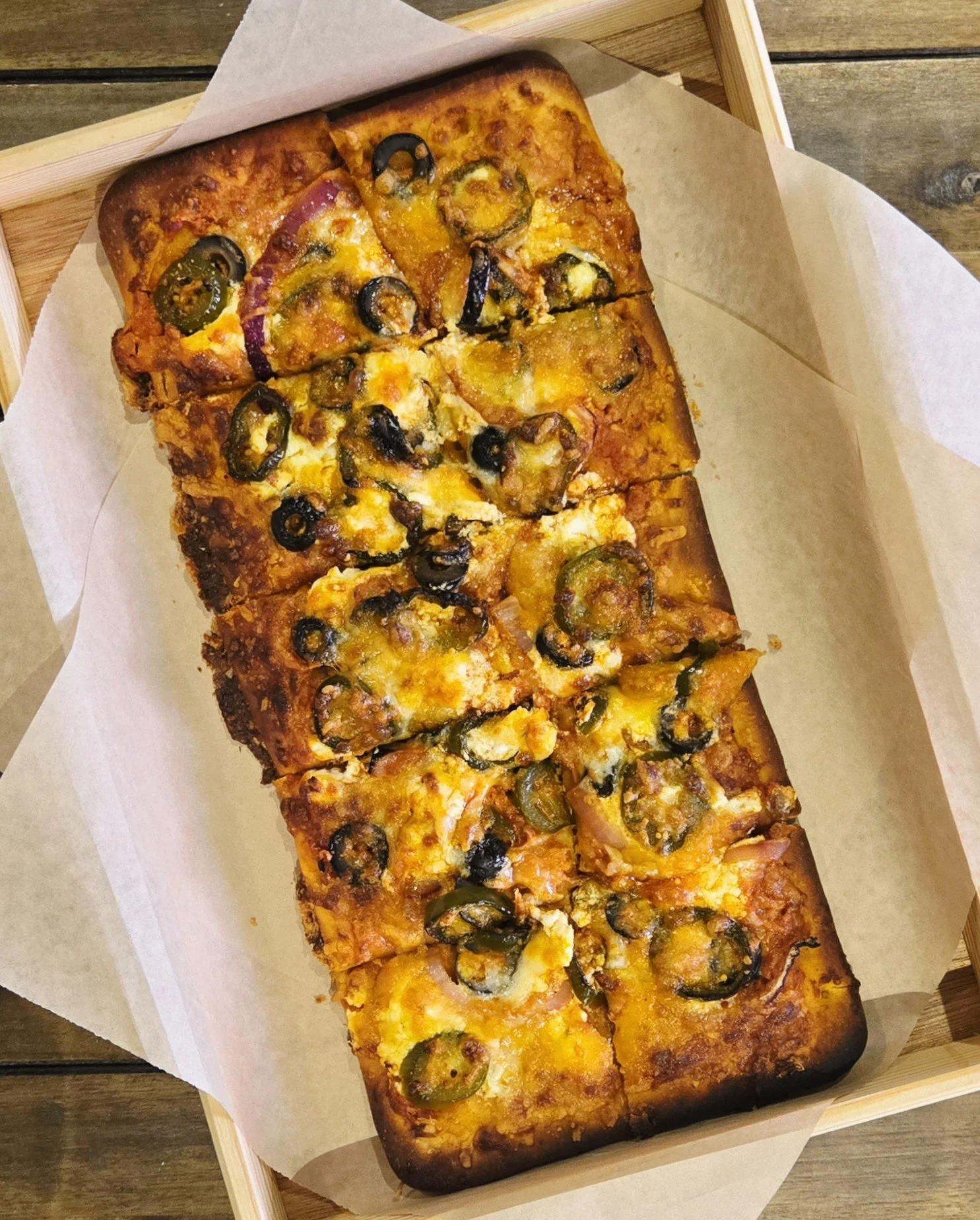 Olive Oil, Chorizo, Crumbled Goat Cheese, Mozzarella, Cheddar, Red Onion & Candied Jalapenos